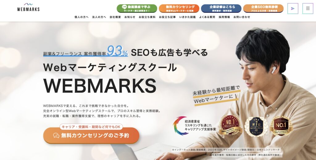 WEBMARKS(ウェブマークス)は、SEO特化型のWebマーケティングスクールとして、検索エンジンからの集客力を高めたい方に特に支持されている教育サービスです。
