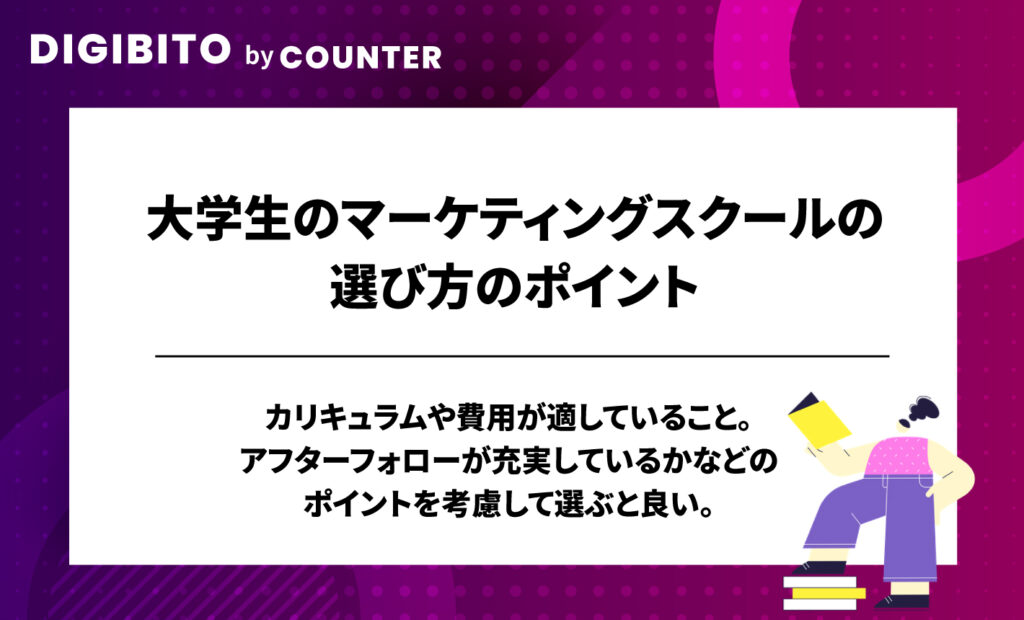 Webマーケティングスクールは数が多く、内容や質もさまざまです。大学生であれば、下記のようなスクール選定のポイントを考慮することが大切です。